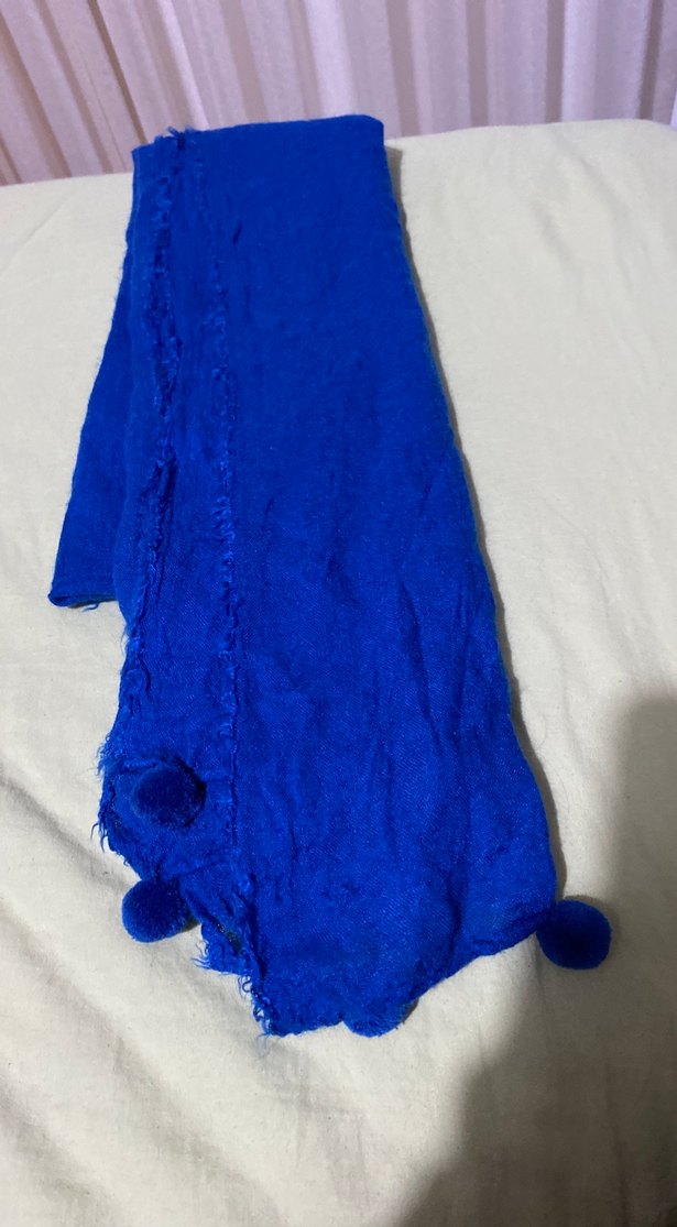 Püsküllü mavi kadın şalı, yumuşak ve sıcak kumaştan, rahat bohem tarzda.