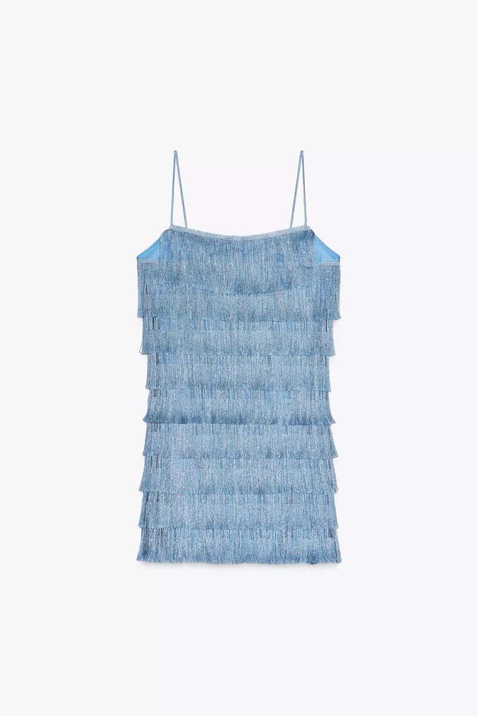 V yaka, kolsuz ve fit kesim mavi mini elbise, püsküller ve açık mavi batik deseniyle parti ve sokak modasına uygun.