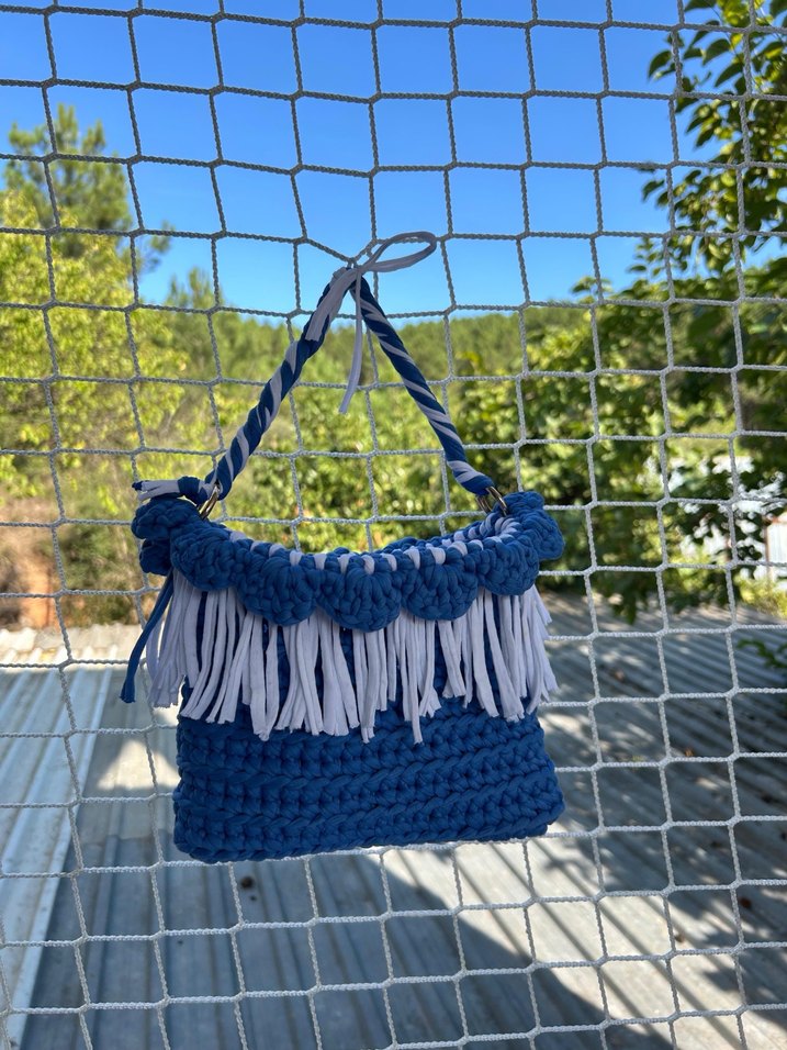 Püsküllü Mavi Örgü Kadın Çanta