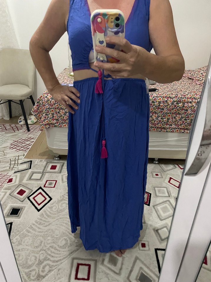 Pamuk kumaştan, V yaka ve püskül detaylı, bol kesim, kolsuz gömlek ve uzun etekli beli lastikli pareo takımı