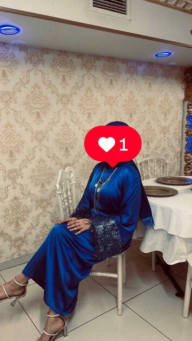 Parlak mavi uzun abiye, yüksek yaka ve uzun kollu etnik desenlere sahip. Püsküllerle süslenmiş, bol kesim ve düğün için uygun. Bazi yerlerinde cekilmeler mecvut. standart beden