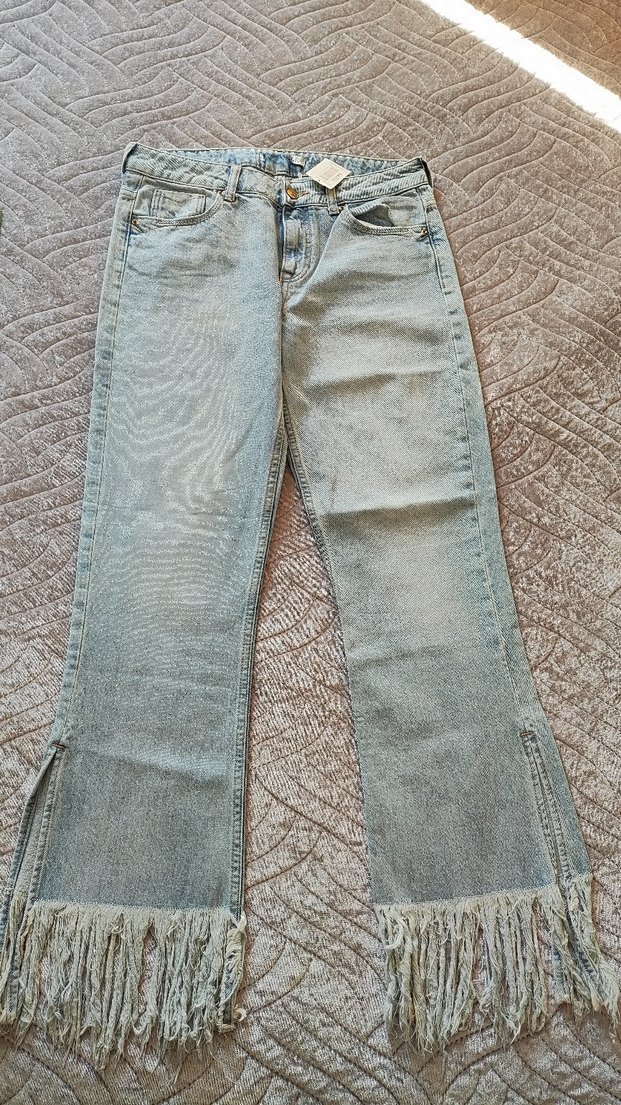Gri tonlarda, yumuşak kot kumaştan yapılmış, püsküllü kenarları ve midi boy uzunluğuyla bohem tarzda, günlük kullanıma uygun regular fit kadın kot pantolon. ihtiyaç fazlası olduğu için satıyorum hediye gelmiştir hiç giyilmemistir 34-36 uyumludur