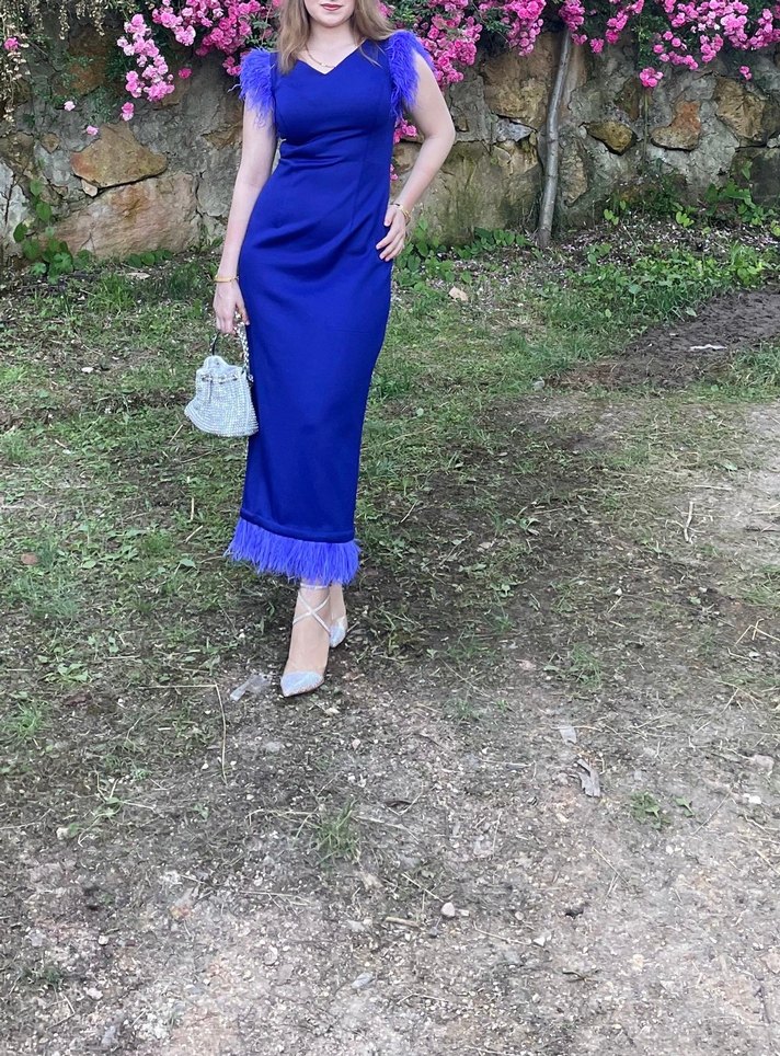 1-2 kere giydim, özel dikim. Çok temiz ve güzel bir elbise, parlak mavi abiye elbise, V yaka ve kolsuz tasarıma sahiptir. Omuzlarda ve etek ucunda püskül detayları bulunuyor.