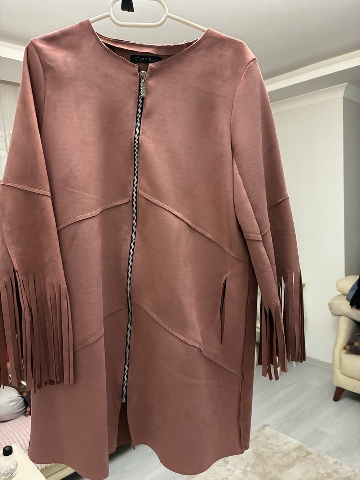 Bej renkte, uzun kollu ve püsküllü detaylara sahip süet midi ceket. Salaş kesimi ve sade yuvarlak yakasıyla rahat ve şık bir görünüm sunar.