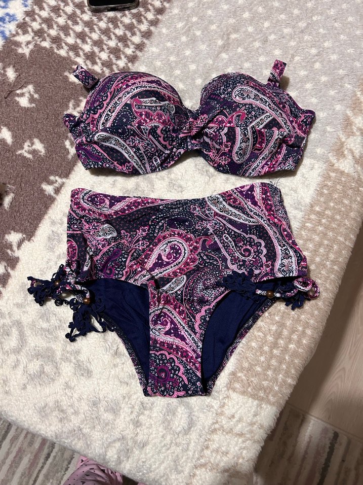 Penti Koyu mor tie-dye desenli, püsküllü ve askılı, mini boy bohem tarzda, plaj için uyumlu dar kesim bikini takımı. 80B