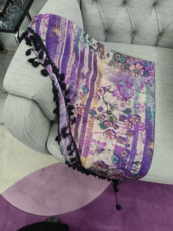Mor ve gri tonlarda, püsküllü ve çiçek desenli bohem tarzda kadın şalı. Hipi ve retro görünüme uygun. adet fiyatı