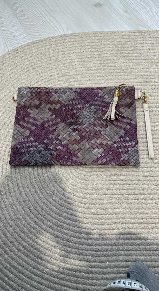 31 E 21 Mor ve gri bağlama desenli, püskül detaylı kadın portföy çanta. Suni deri bohem tarzına uygundur.