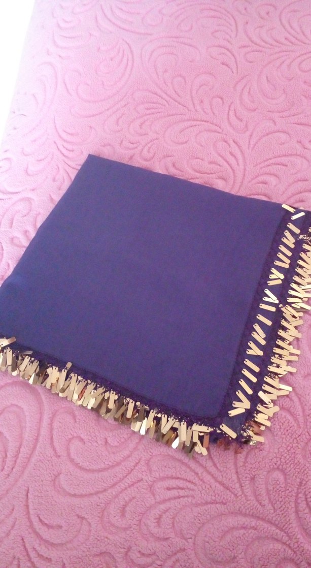 Mor renkte, kenarlarında parlak püsküller bulunan tekstil fular. Tesettür ve bohem tarzı bir arada sunar.