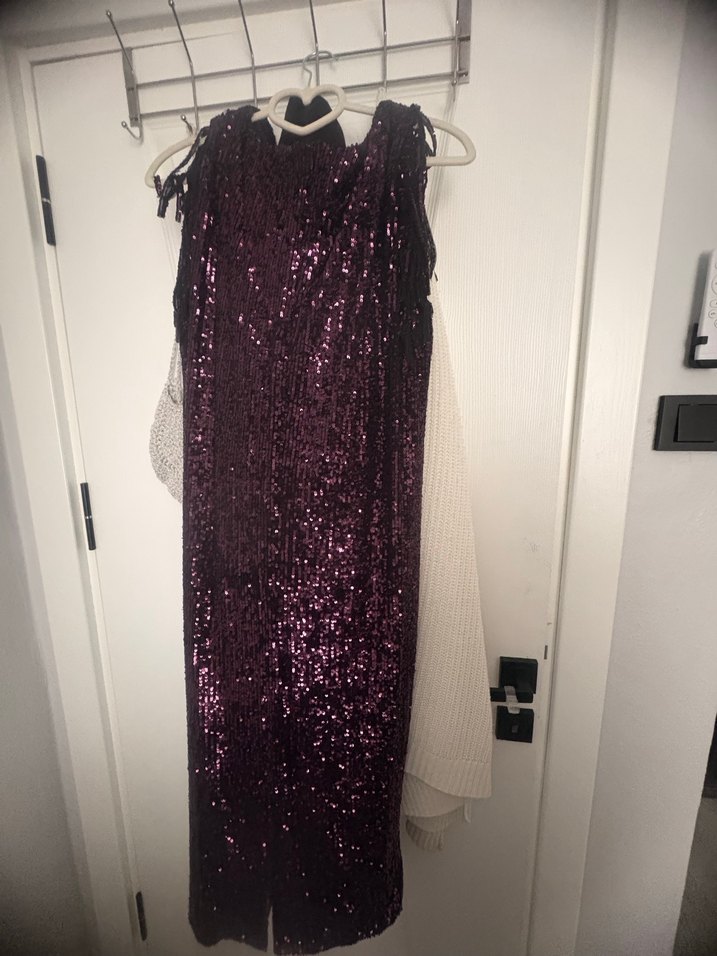 Bu mor, v yaka ve ince askılı, püsküllü ve payetli, göz alıcı gotik tarzda, dar kesim midi abiye elbisedir. Partiler için uygundur. Çok kaliteli sadece 1 kere giydim temiz alın ve direk giyin✨