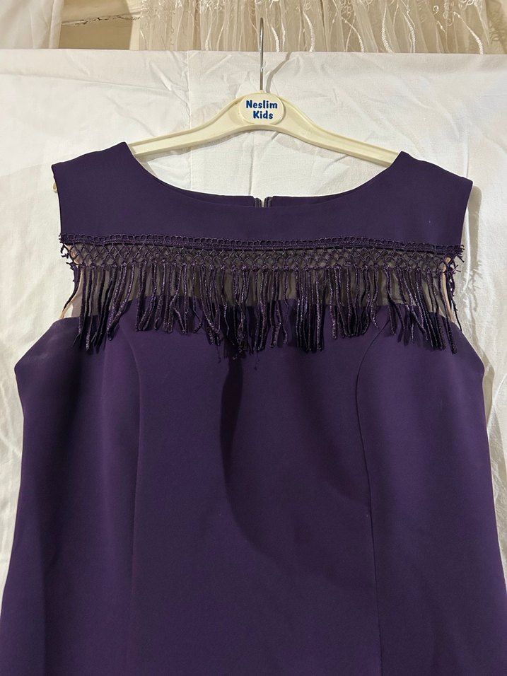 Mor, kayık yaka, kolsuz midi elbise. Püskül detaylı, nakışlı ve normal kesim, bohem tarzı partiler için uygundur.