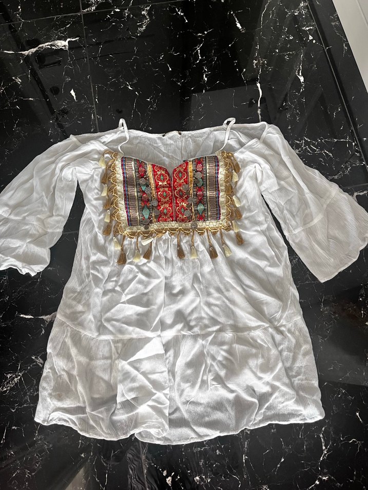 Uzun kollu, askısız beyaz tunik. Göğüs kısmında renkli nakışlar ve püskül detayları bulunur. Bol kesim, mini boy.
