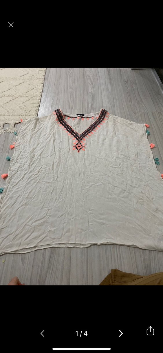 V yaka, kısa kollu, bol kesim beyaz bohem pareo Nakış detayları ve yanlarda renkli püsküllerle süslenmiş, uzun kesimiyle rahat bir görünüm sunar.