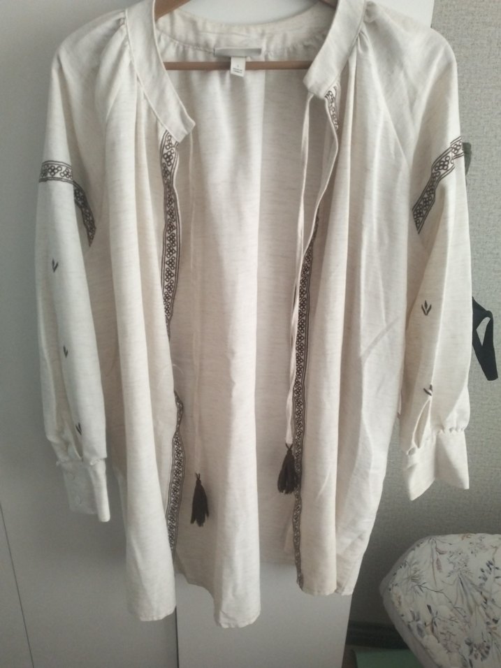 Pamuklu, uzun kollu, nakışlı ve püsküllü detaylara sahip beyaz bohem ceket. Salaş kesim ve normal midi boyda.