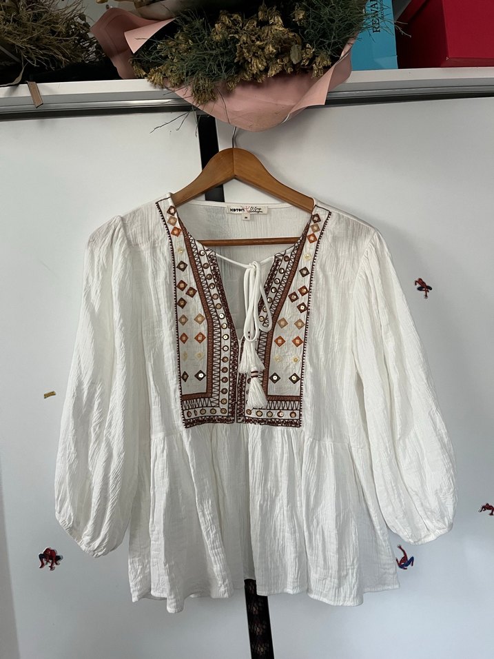 Bu beyaz bohem bluz, uzun kollu ve püsküllü bağcıklarla süslenmiş nakışlı V yakaya sahiptir. Rahat kesim ve midi uzunlukta, hafif kumaştan günlük kullanıma uygundur.