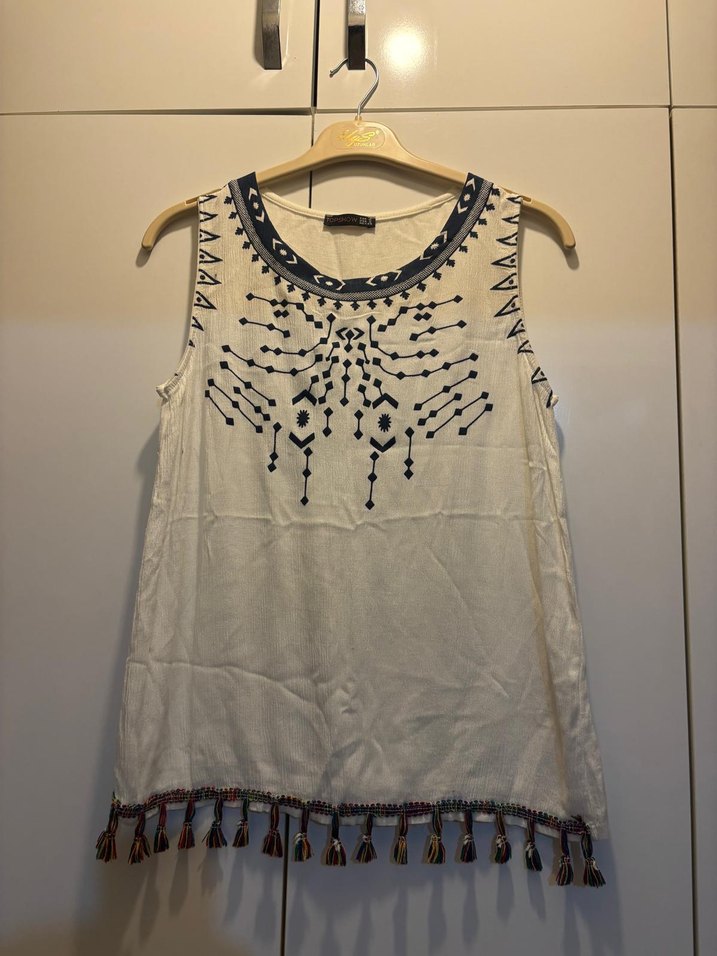 Nakış desenli, püsküllü, kolsuz beyaz bluz. Yuvarlak yaka ve bol kesimle bohem tarzını yansıtıyor. ✨