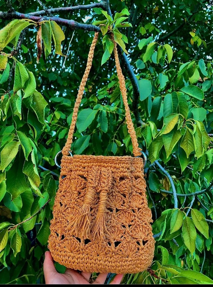 Kahverengi örgü çanta, nakışlı desenler ve püskül detaylarıyla parlak bohem tarzını yansıtıyor, günlük kullanım için uygun. Marka değildir. Kendim el emeğimle yaptım.