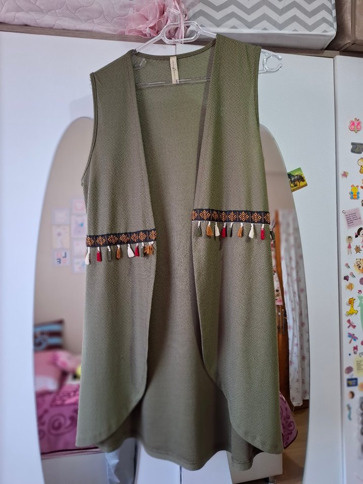 Püskül detaylı nakış işlemeli, bol kesim, askısız yakalı uzun i yelek. Günlük kullanıma uygun.