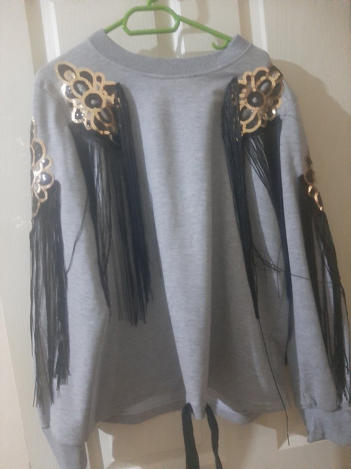 Gri renkli, uzun kollu, yuvarlak yakalı örme kumaştan sweatshirt. Nakışlı desenler ve püsküllerle süslenmiş, bol kesim, bohem tarzda günlük kullanıma uygun.