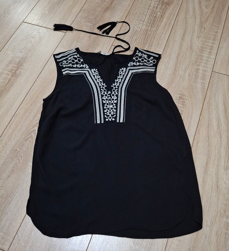 V yaka, kolsuz,keten kumaş,nakışlı ve püsküllü detaylara sahip siyah bohem bluz Rahat kesimi ile günlük ve resmi kullanıma uygundur.Çok az giydiğim bir bluz Çünkü benzerleri o kadar çok ki.Temiz bir ürün.Elinize ulaştığında mağazadan yeni almışsınız gibi olacaktır emin olun.36 ve 38 beden giyebilir.Şimdiden alıcısına hayırlı olsun