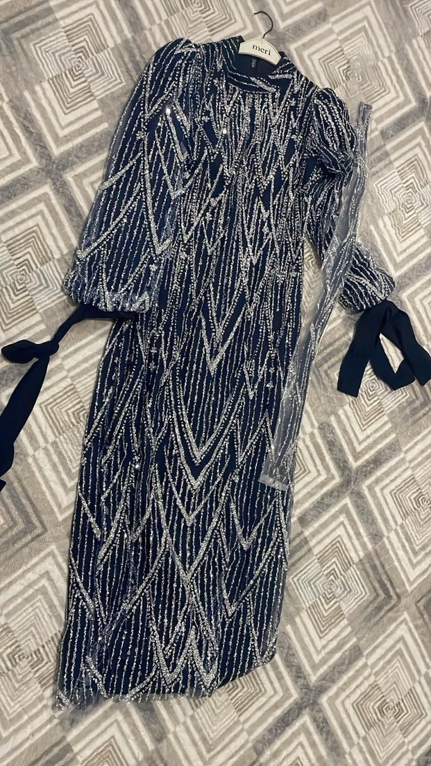 Lacivert uzun abiye, nakışlı ve püsküllü detaylara sahip. Uzun kollu, fiyonk bağlamalı ve tekne yaka ile bohem, avangart tarz sunar. 1 defa giyildi sorunsuz
