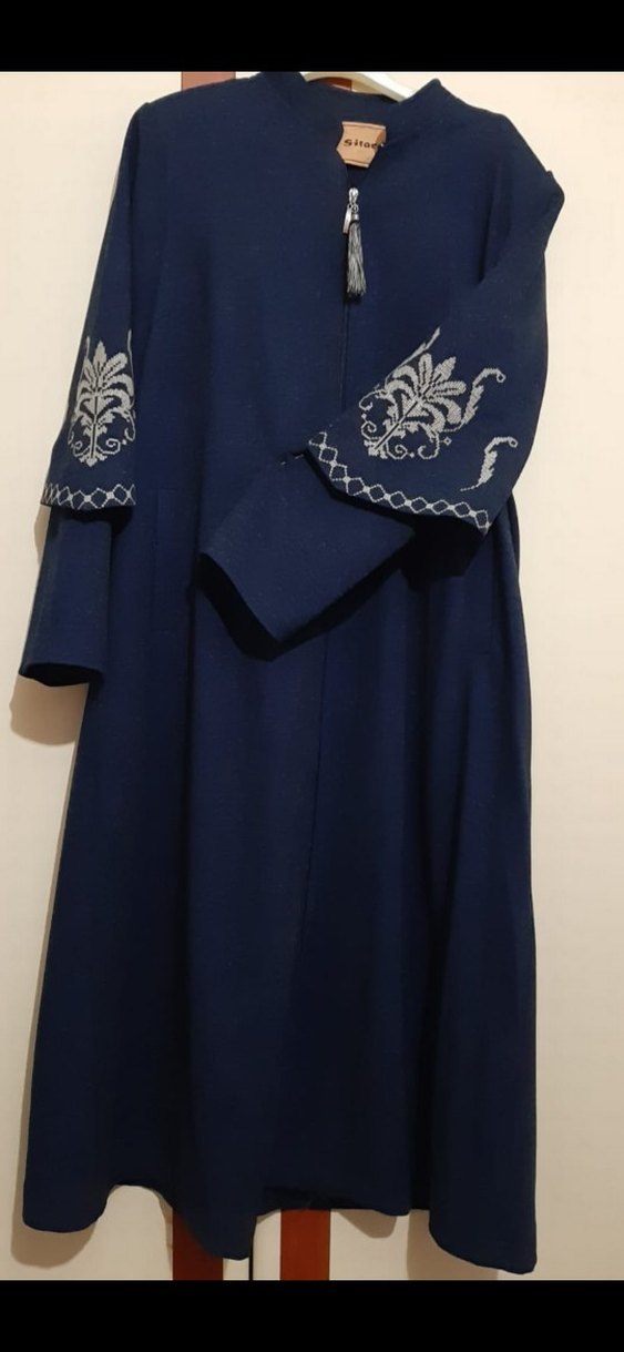 Lacivert uzun elbise, notalı yaka ve uzun kollarda nakış detaylarıyla. Püskül aksesuarı, düzenli kesim ve sentetik kumaştan, ofis için uygun.