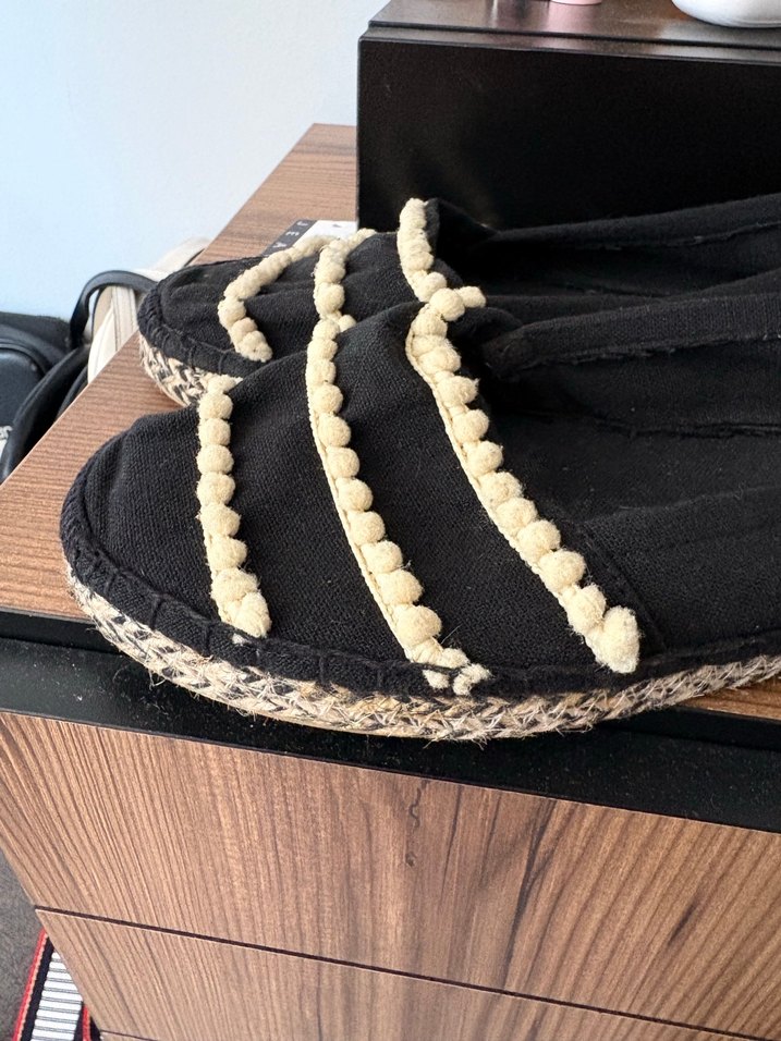 Nakış desenli ve püsküllü detaylara sahip, kauçuk tabanlı siyah bohem dolgu topuk espadril. Hiç giyilmemiştir