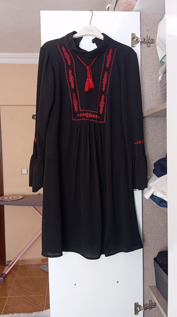 Bu siyah bohem tunik, uzun kollu, yüksek yakalı ve kırmızı nakışlı desenlerle püsküllü. Rahat kesimli ve orta boy, yumuşak kumaştan yapılmıştır. Günlük kullanıma uygun.