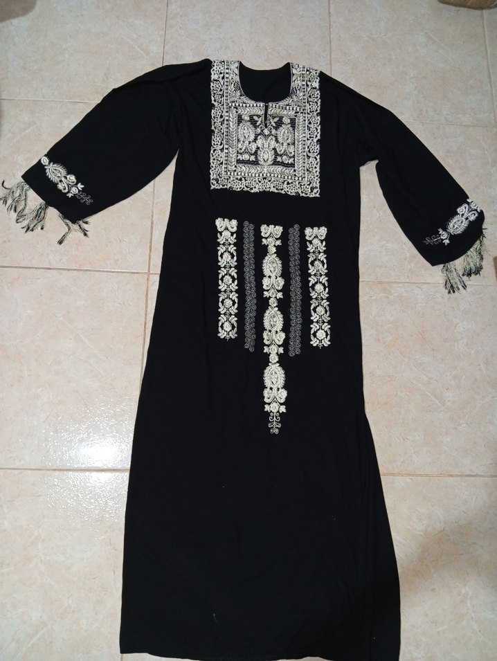 Siyah uzun elbise, beyaz nakış desenleri ve kollarında püsküllerle süslenmiştir. Bol kesim, uzun kollu ve yuvarlak yakalıdır. Günlük kullanıma uygundur.