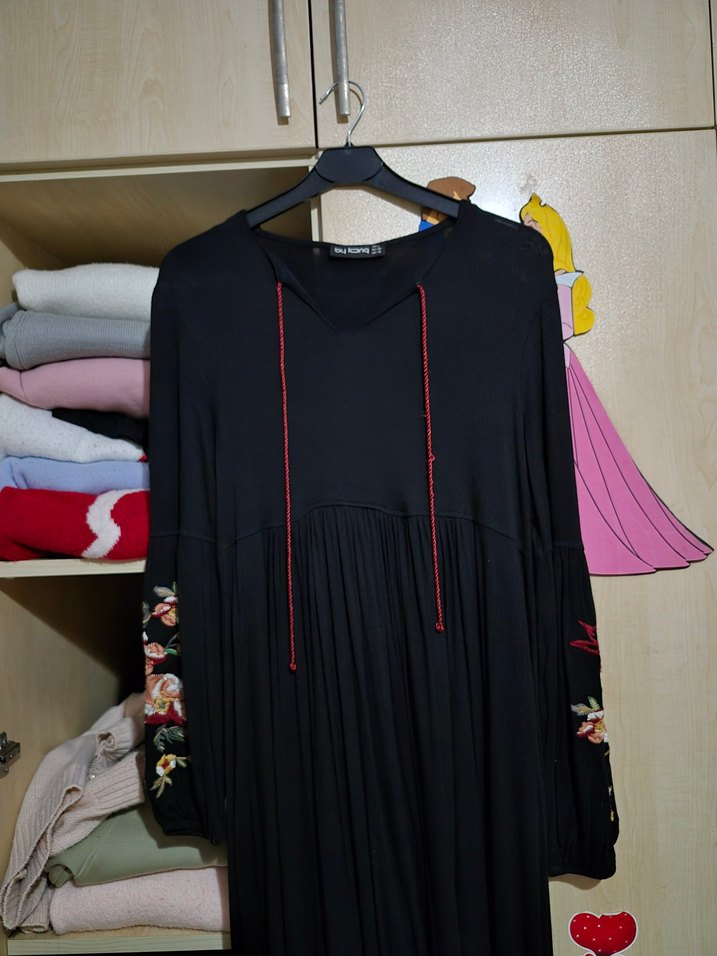 Siyah uzun kollu, bol kesim bohem elbise. V yaka, nakışlı desenler ve püskül detayları bulunur. Yumuşak dokulu kumaştan üretilmiştir.