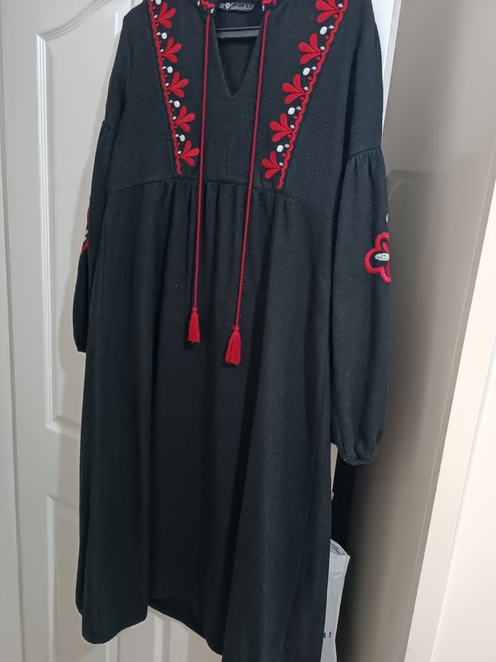 Püsküllü Nakışlı Siyah Bohem Uzun Elbise