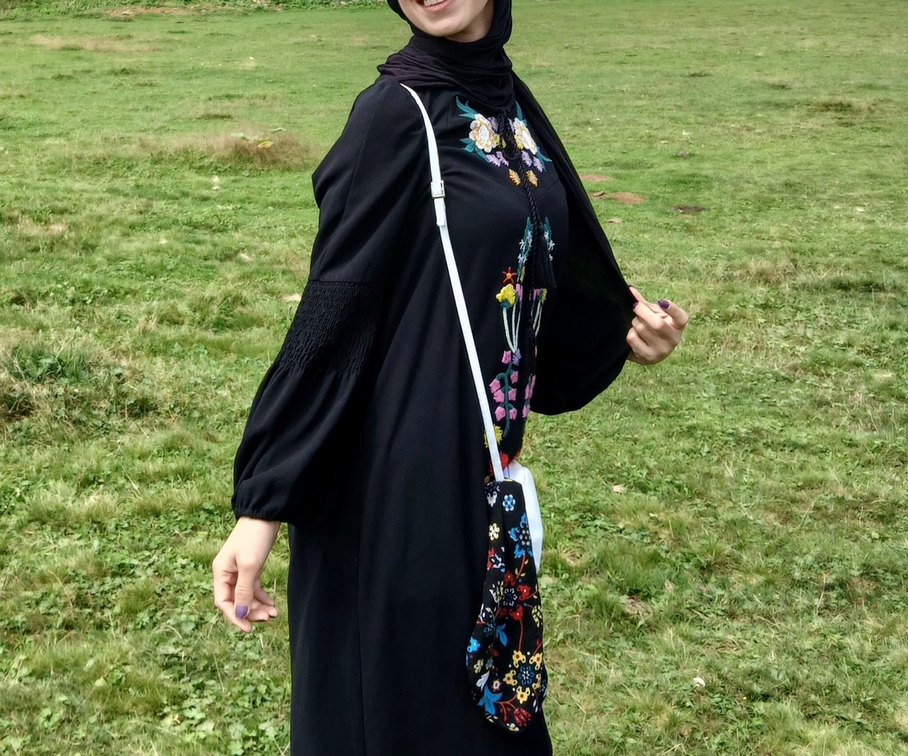 Yüksek yakalı ve uzun kollu siyah uzun elbise, yumuşak sentetik kumaştan, nakışlı çiçek desenleri ve püskül detaylarıyla. Rahat ve bol kesimli, günlük kullanıma uygun.