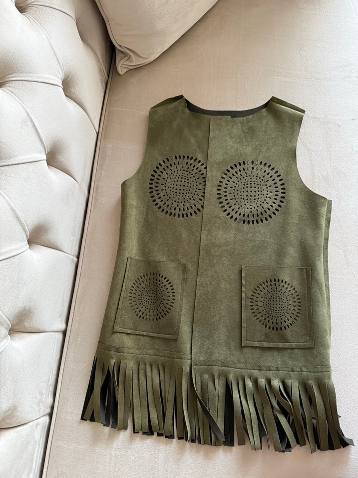 Nakışlı dairesel desenler ve püskül detaylı, kolsuz haki süet yelek. Tarz bir üründür.1 kez giyildi. Herhangi bir kusuru yoktur.