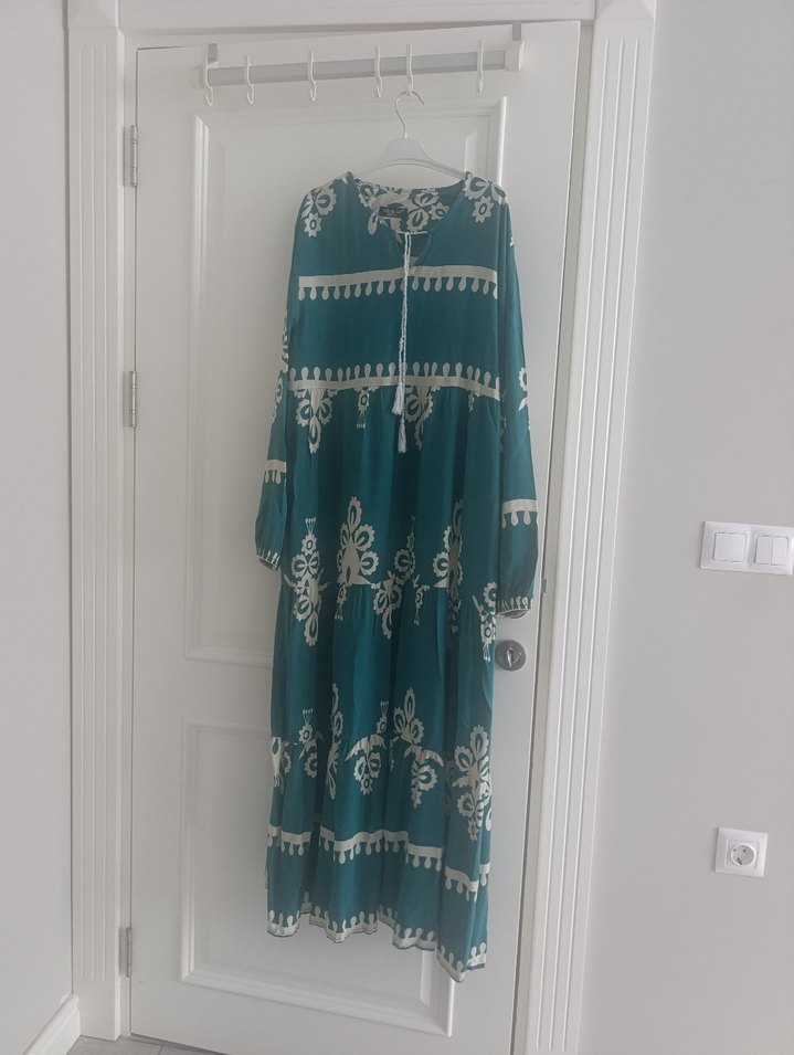 Turkuaz renkli, nakışlı desenlere ve püskül detaylara sahip bol kesim uzun elbise. Uzun kollu ve yuvarlak yakalı, tekstil kumaştan.