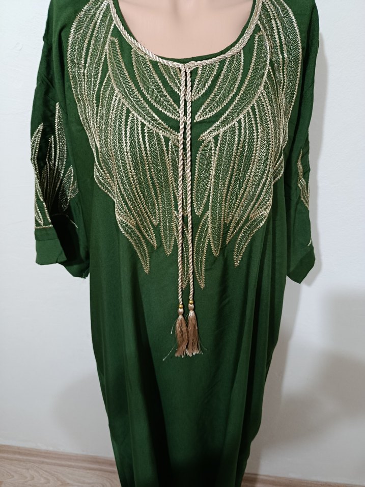 Yeşil uzun elbise, parlak nakış desenleri ve püsküllerle süslenmiş, ipeksi kumaştan, bol kesim ve uzun kollu, bohem tarz sevenlere uygun.