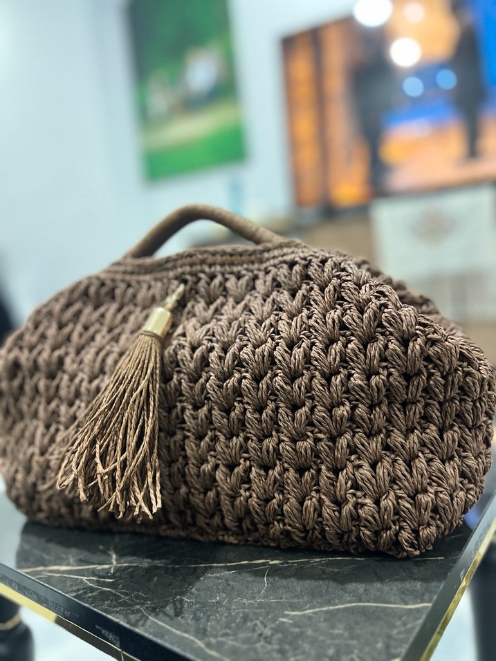 Örgü malzemeden yapılmış, işlemeli desenli ve püskül detaylı bohem tarzı kahverengi kadın çantası, günlük kullanıma uygun. (Tamamen el örgüsüdür. İçi astarlı üçgen burslu)