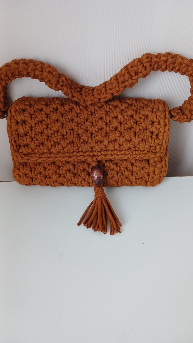 Kahverengi örgü kadın çanta, püskül detayı ve kalın örme sapıyla rahat bohem tarzını yansıtıyor, günlük kullanıma uygun.
