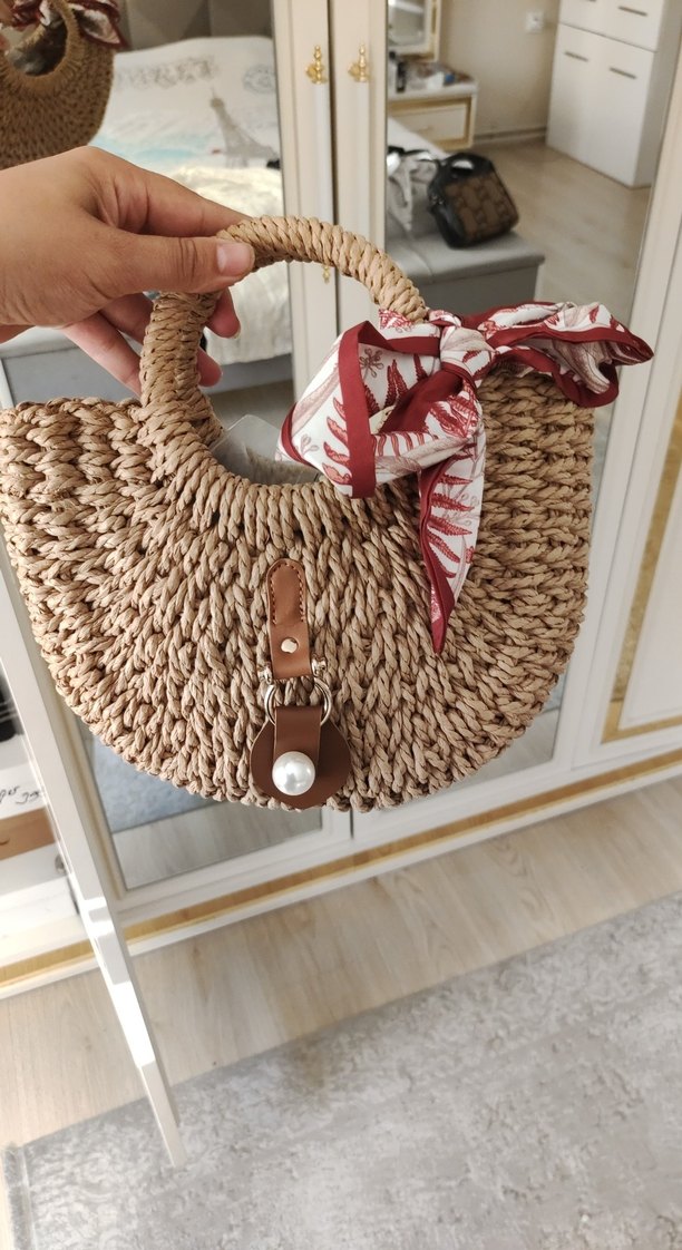 Açık kahverengi örgü dokulu, nakış detaylı ve püsküllü bohem tarz kadın çantası. Yuvarlak saplı, yanında dekoratif fular bulunur. Günlük kullanıma uygun.