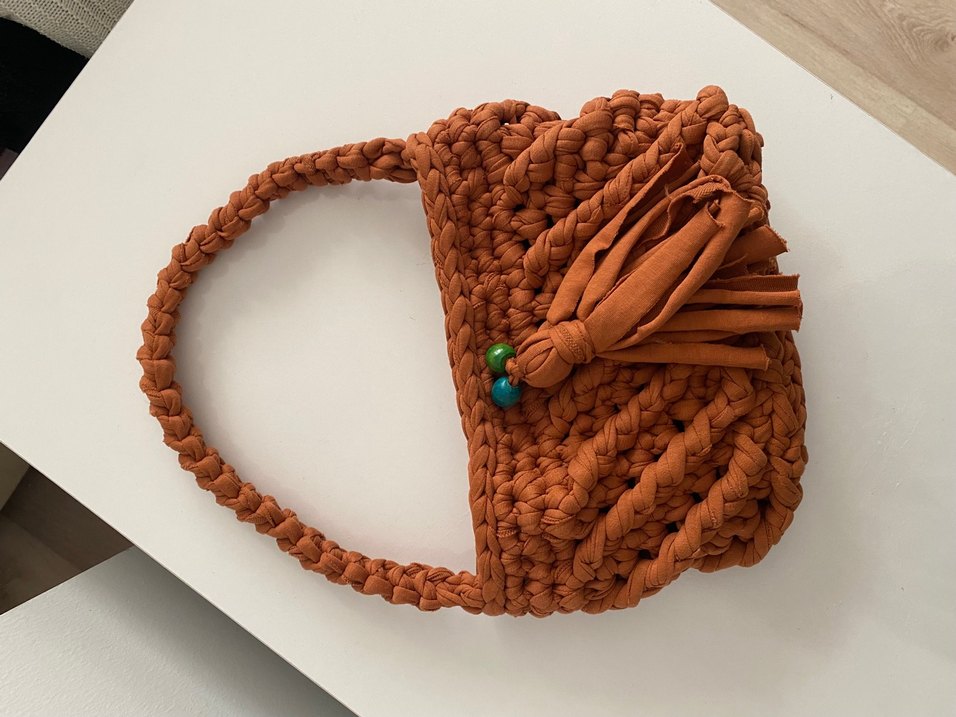 Kiremit rengi el örgüsü yapılmış, püsküllü ve renkli boncuk detaylı kadın çantası. Bozcaada’dan almıştım sadece bir kez kullandım. Tertemiz ve sağlamAlana hayırlı olsun