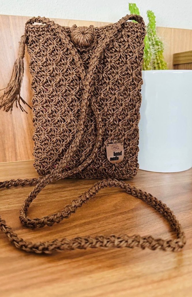 Püsküllü detaylı, nakışlı örgü kahverengi çapraz çanta, bohem tarz için uygun. Hiç kullanılmadı marka temsilidir