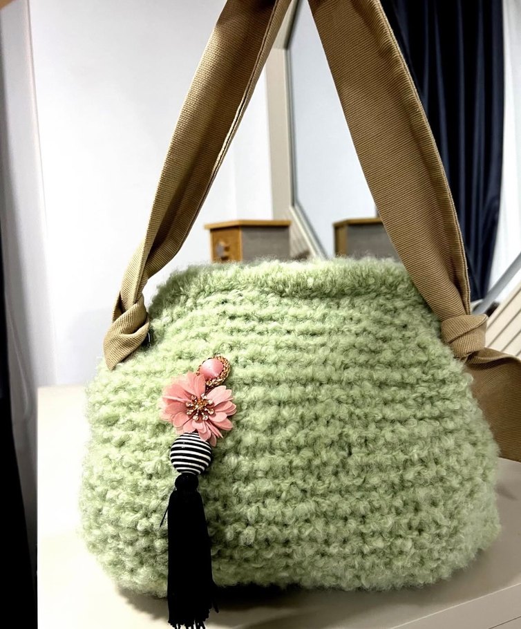 Pastel yeşil örgü kadın çanta, geniş askı ve püsküllü süslemeye sahiptir, rahat ve bohem tarz için uygundur.