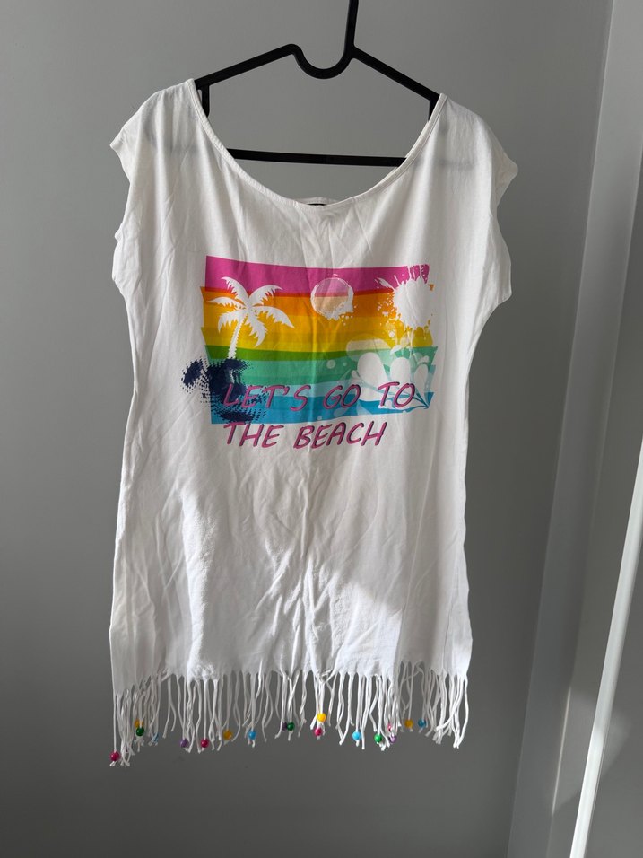 Püsküllü, askısız pamuklu, bol kesim üst. Üzerinde 'Let's go to the beach' yazılı renkli plaj baskısı bulunur. Plaj için uygundur.