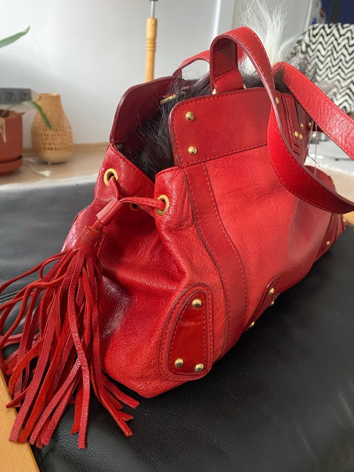 Parlak kırmızı deri kadın çanta, püsküllü detaylarla cesur ve Paris tarzı bir görünüm sunar. SATILDI.