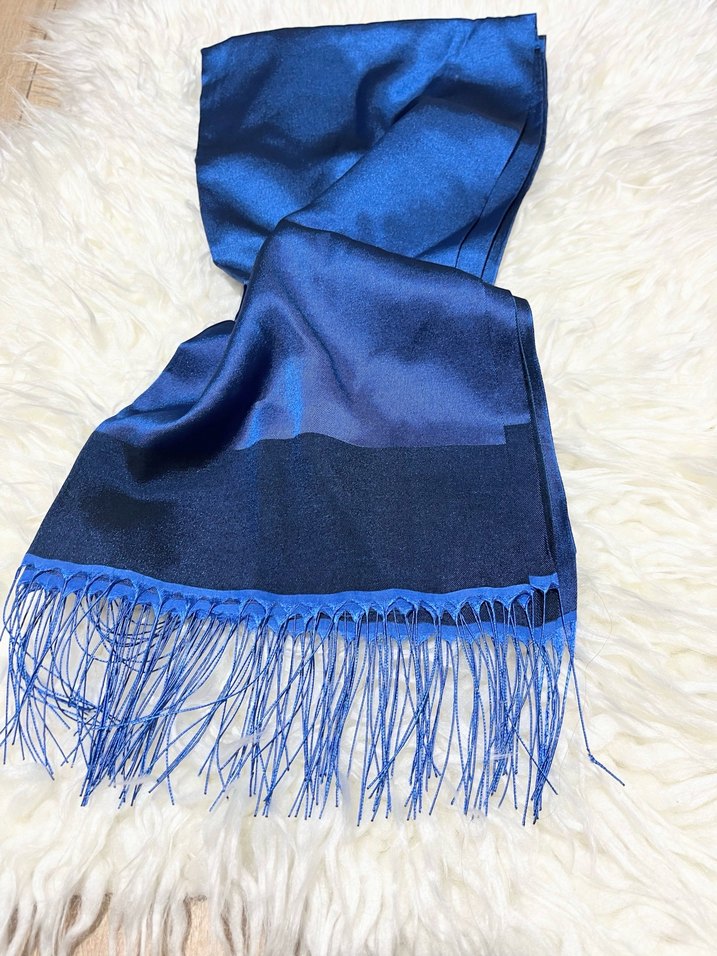 Parlak mavi renkte, ipeksi dokulu ve püskül detaylı kadın şalı, bohem ve rahat bir stil sunar.✨