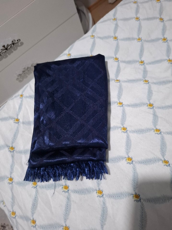Parlak mavi renkte, sentetik kumaştan yapılmış kadın şalı. Kenarlarında püsküller bulunur, sade ve rahat bir görünüm sağlar.