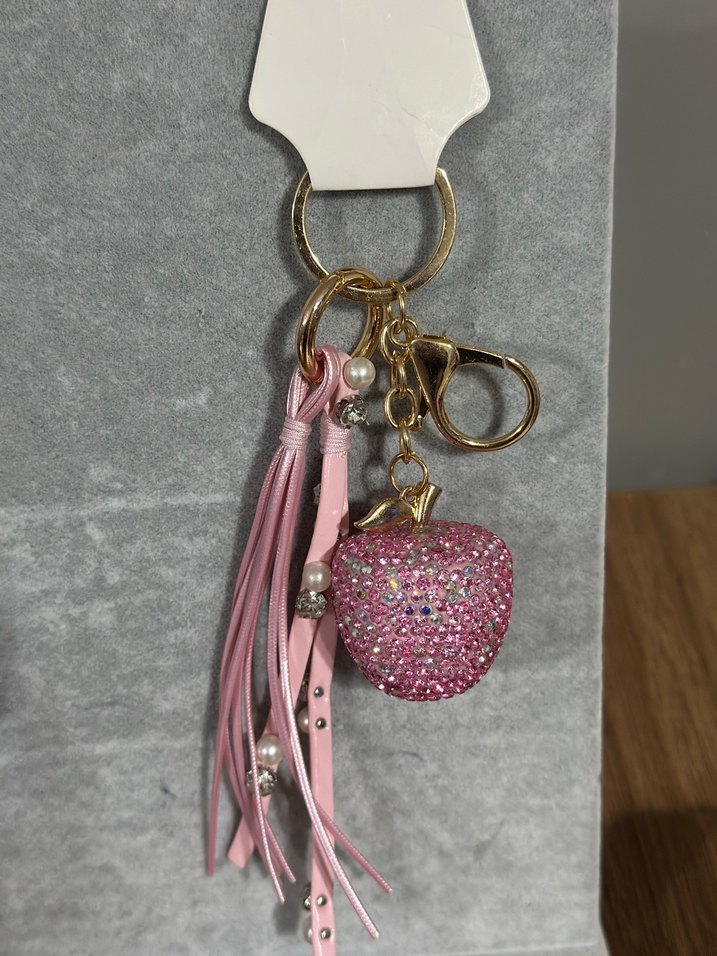 Püsküllü ve ışıltılı elma figürlü pembe bohem anahtarlık, anahtarlarınıza renkli ve göz alıcı bir dokunuş katar.