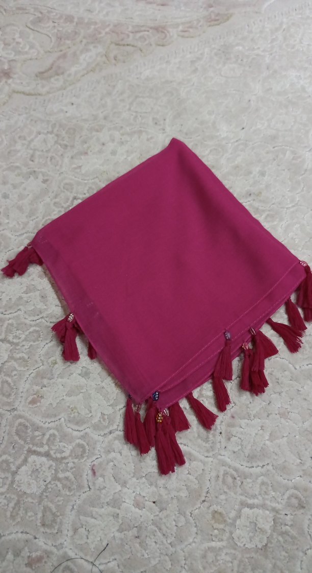 Püsküllü kenarları olan canlı pembe renkte, yumuşak sentetik kumaştan yapılmış bohem tarzda kadın şalı. ÇEYİZLİK YAZMA