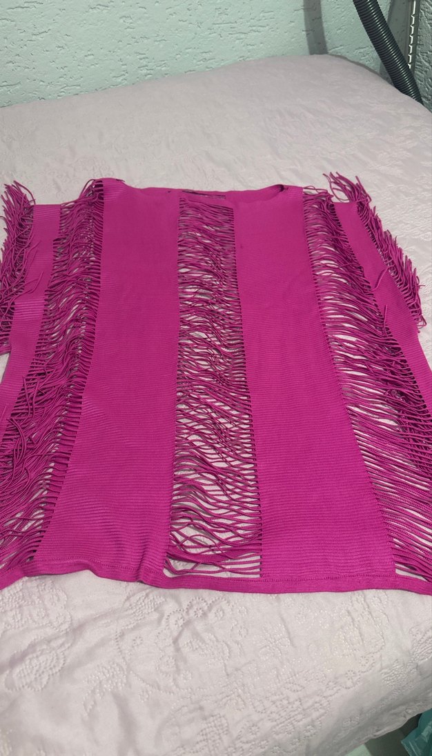 Canlı pembe renkte, sentetik kumaştan yapılmış, püsküllü ve drapeli bohem tarzı kadın preyo
