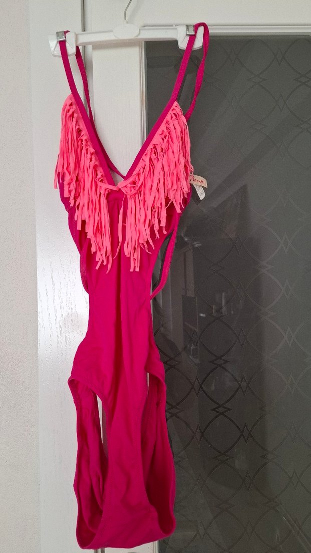 Püsküllü ve ince askılı, pembe bohem tarzı kadın mayo, renkli ve cesur parti kombinleri için uygun.