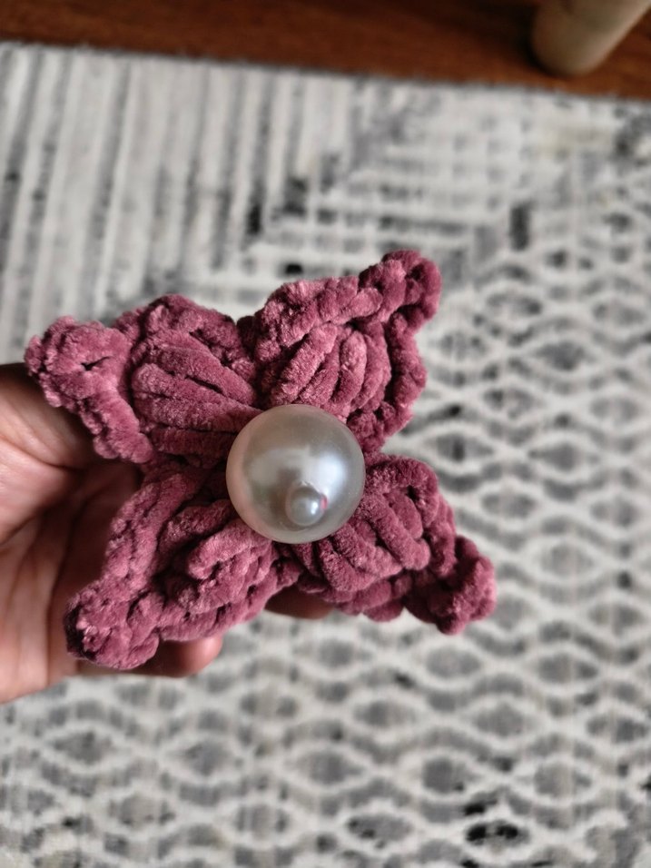 Kadipe ip ve inci ortası bulunan pembe çiçek toka, günlük kullanıma uygun bohem stilde.