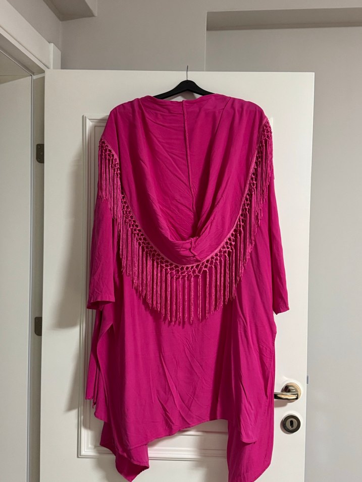 Kadın şalı, püsküllü detaylar ve parlak pembe ipekimsi kumaş ile bohem tarzını yansıtıyor. İthal üründür